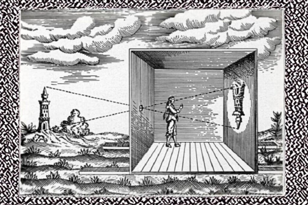Dans une pièce sombre percée d’un petit trou, la lumière projette une image inversée du monde extérieur sur un mur opposé.